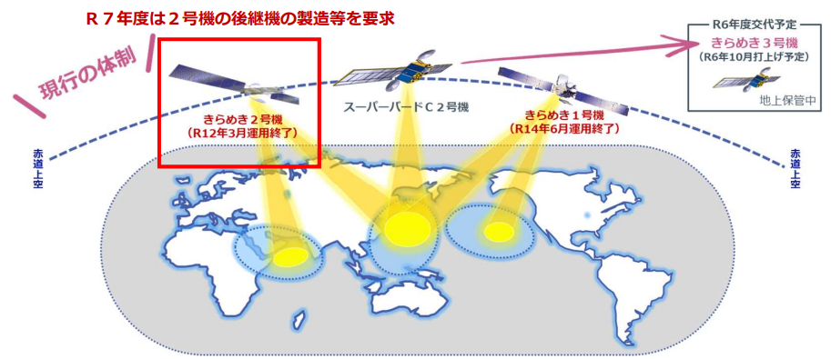 A constellation of communications and electronic eavesdropping satellites was also developed. These satellites were designed to operate in geostationary orbit with X-band communications capabilities. Rather than building, launching, and operating them directly, JMoD used a private finance initiative (PFI). A PFI is a type of public-private partnership (PPP) originally developed in the UK. Under a PFI, a private firm or consortium of firms is contracted to build, own, and operate a public service. In this case JMoD signed a contract with DSN Corporation, a joint venture of SKY Perfect JSAT, NEC, NTT Communications, and Maeda Corporation, to build and operate an X-Band satellite network for the military. The first bird, DSN-1, more commonly known as Kirameki-1 (きらめき1号機), was not a standalone satellite. Whether DSN and JMoD were in a hurry or just trying to save some money, the defense payload was added to a JSAT commercial satellite, Superbird-8. However, an overpressure accident during transportation damaged the satellite, and repairs took two years. Kirameki-1 finally went into orbit in April 2018. By that time a dedicated defense mission, Kirameki-2 (DSN-2 or きらめき2号機), had already been launched in January 2017. Kirameki-3 (きらめき3号機) was launched on an H3 rocket in November 2024. These satellites have approximately 15-year lifetimes, and Kirameki-2 is currently expected to end operations in March 2030 and Kirameki-1 in June 2032.
